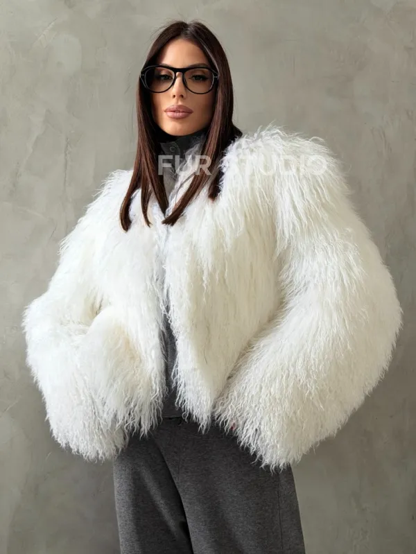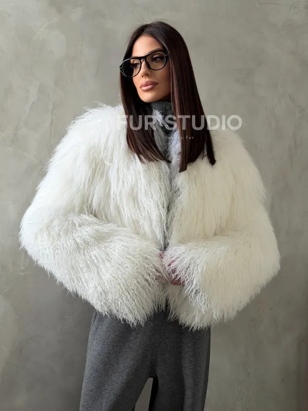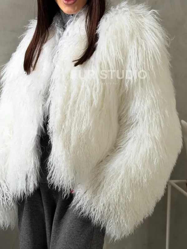 Белая кроп-шуба из меха ламы 102778