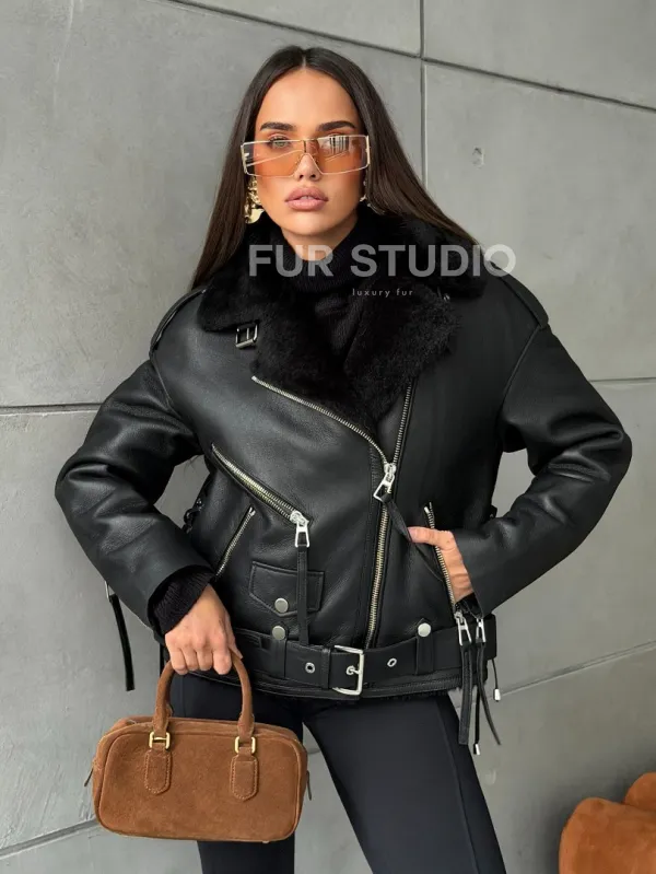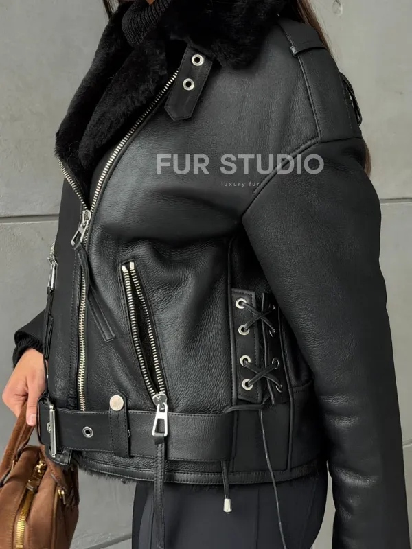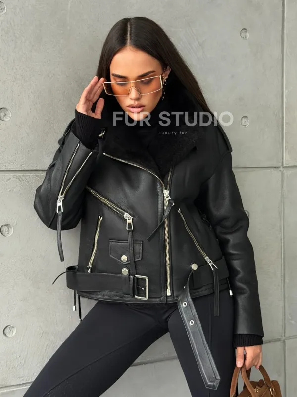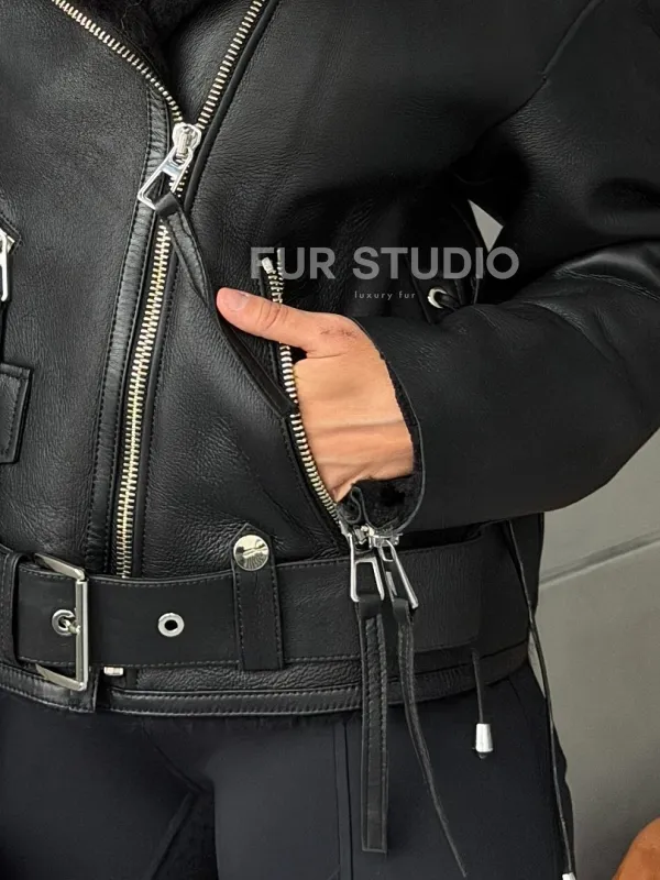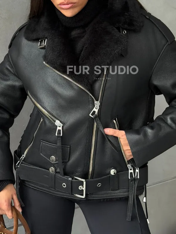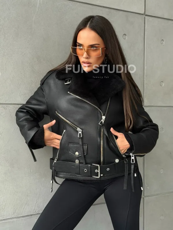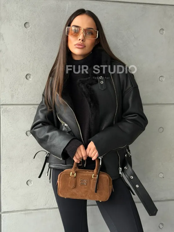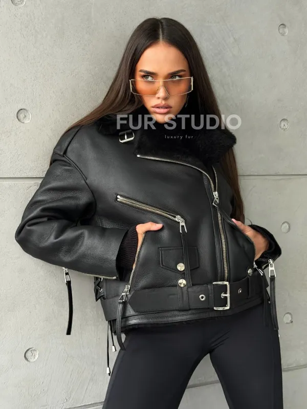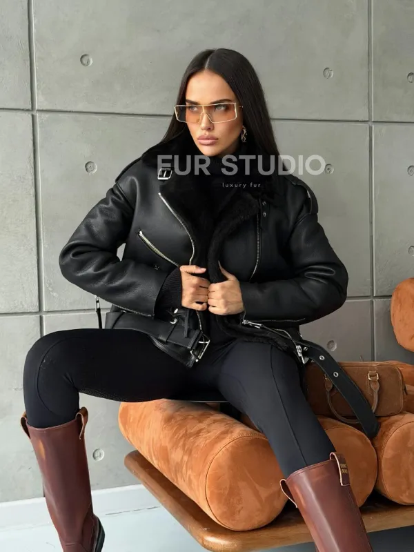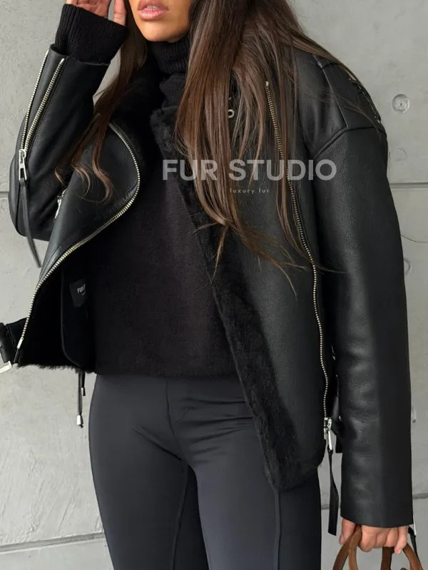 Черная короткая дубленка авиатор 102802