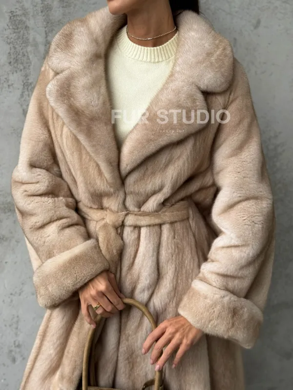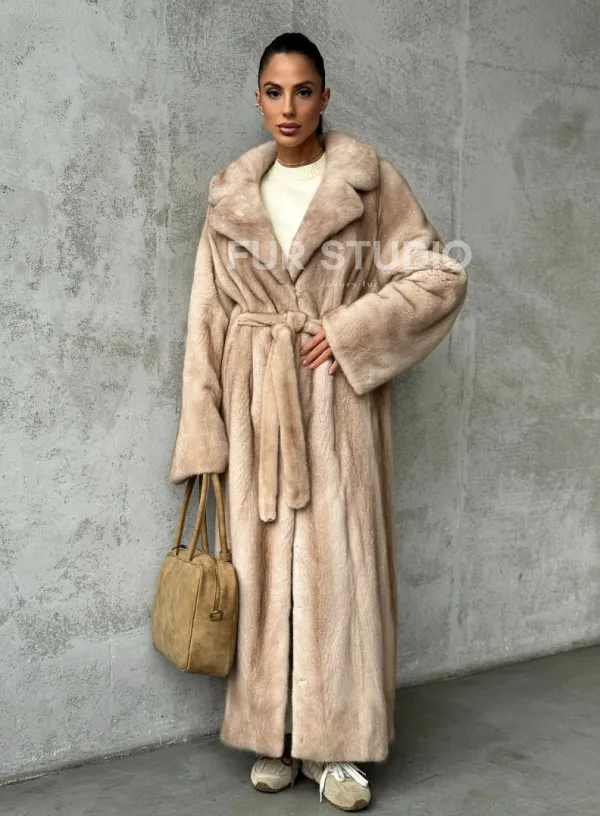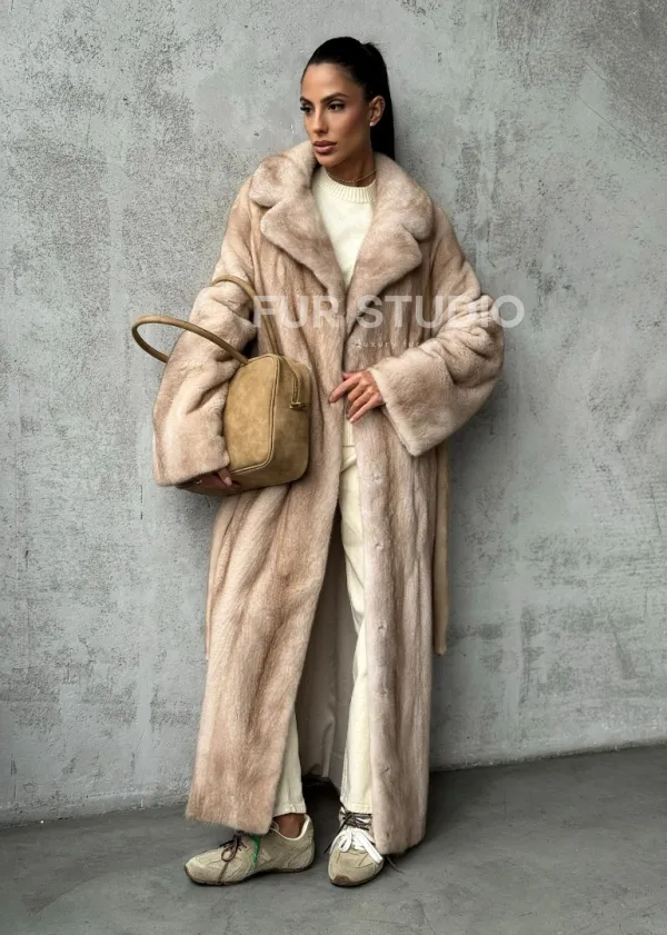 Мех данной шубы аукционная норка , цвет бежевый. Предлагается в размерах от 42 до 50. Длина модели 125-130 см, что выгодно подчеркивает фигуру девушек. Эта модель идеально подойдет для девушек и женщин, предпочитающих роскошные натуральные меха.