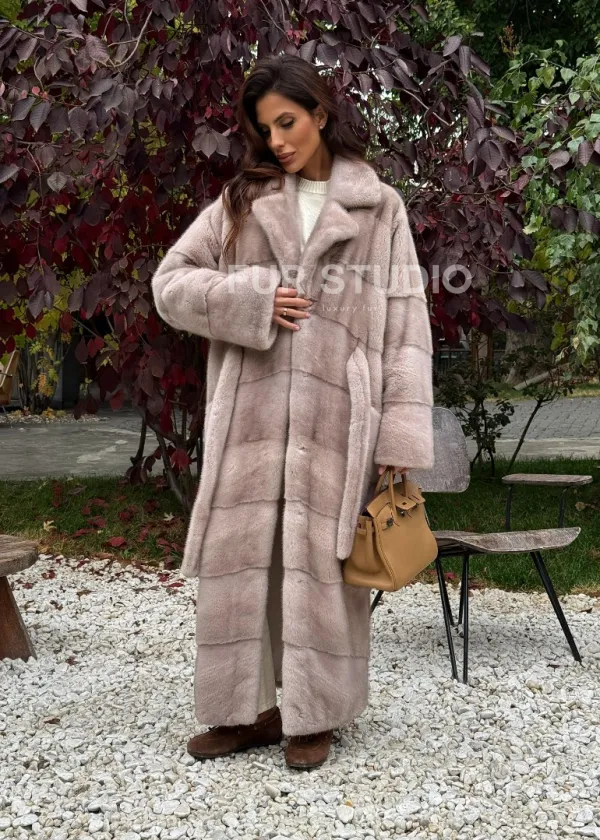 Мех данной шубы аукционная норка , цвет бежевый. Предлагается в размерах от oversize (42 до 50). Длина модели 125-130 см, что выгодно подчеркивает фигуру девушек. Эта модель идеально подойдет для девушек и женщин, предпочитающих роскошные натуральные меха.