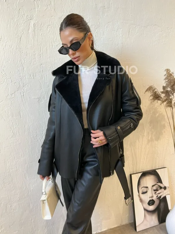 Дубленка авиатор в черном цвете из натуральной овчины - выбор стильных и уверенных женщин. Авиатор модель, которая будет к лицу дамам любого возраста. Теплая овчина согреет в прохладное время года. Кожа приятна на ощупь и неприхотлива в уходе. Материал высокого качества. Стильные заклепки и декоративные фермуары создают дерзкий и немного грубый образ.