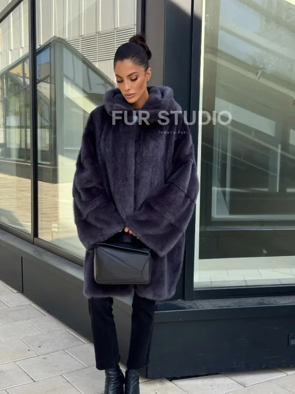 Норковая шуба с капюшоном, роспуск - темный графит 101052