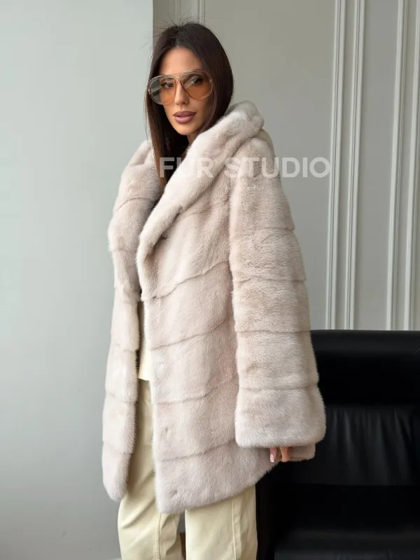 Мех данной шубы аукционная норка , цвет бежевый. Предлагается в размерах от 42 до 52. Длина модели 75-80 см, что выгодно подчеркивает фигуру девушек. Эта модель идеально подойдет для девушек и женщин, предпочитающих роскошные натуральные меха.