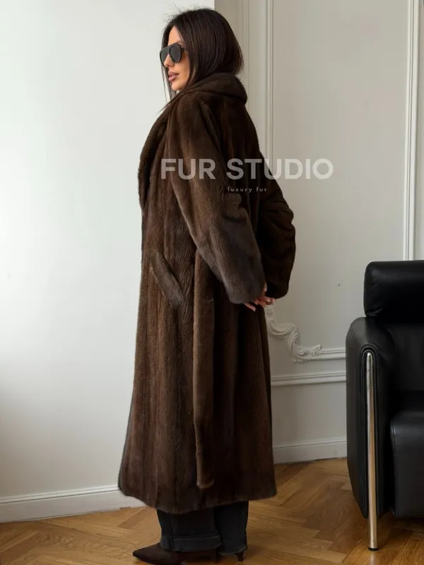 Мех данной шубы аукционная норка , цвет коричневый. Предлагается в размерах от 42 до 52. Длина модели 115-120 см, что выгодно подчеркивает фигуру девушек. Эта модель идеально подойдет для девушек и женщин, предпочитающих роскошные натуральные меха.