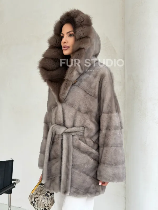 Серый норковый полушубок - капюшон куница 102553