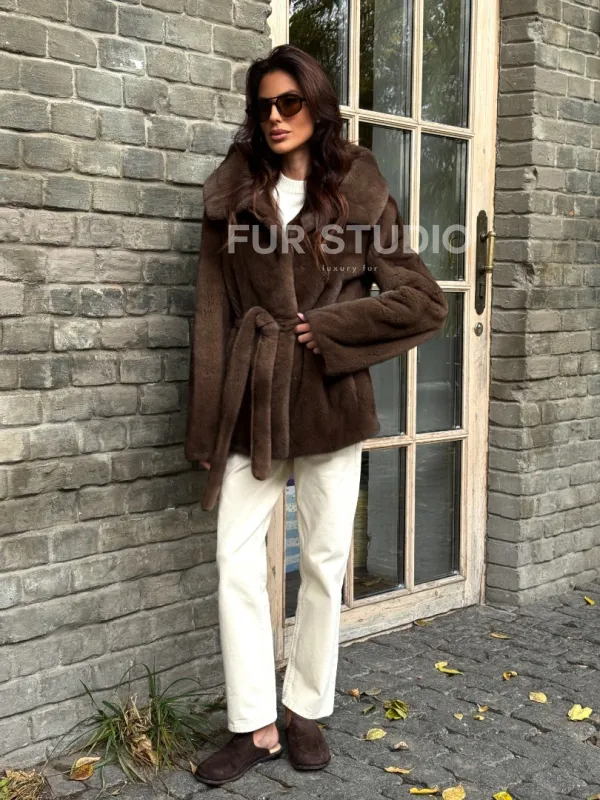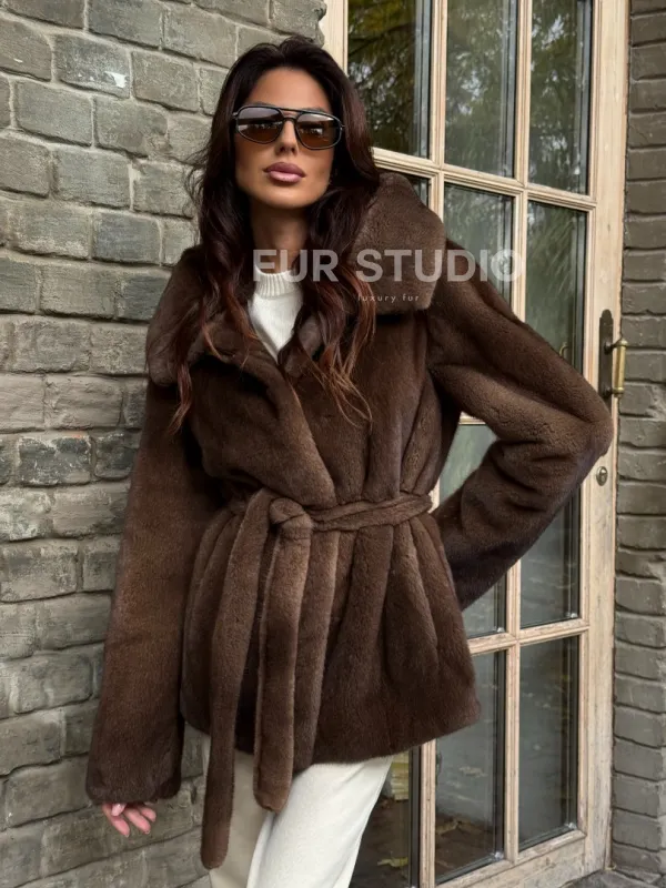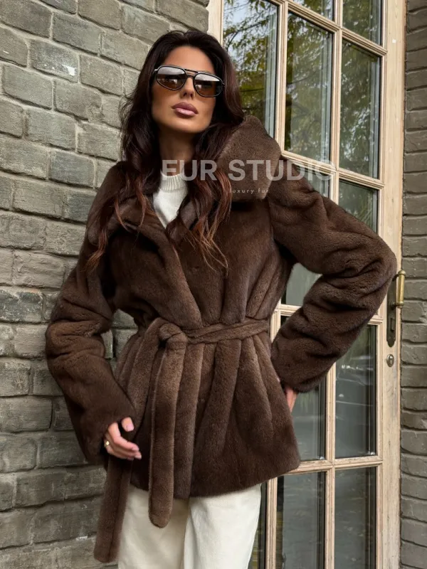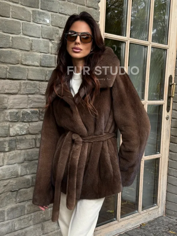 Мех данной шубы аукционная норка, цвет коричневый. Предлагается в размерах от 42 до 52. Длина модели 70-75 см, что выгодно подчеркивает фигуру девушек. Эта модель идеально подойдет для девушек и женщин, предпочитающих роскошные натуральные меха.