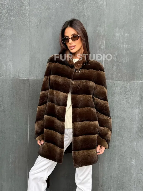 Мех данной шубы кролик рекс , цвет коричневый. Предлагается в размерах от 40 до 42. Длина модели 75-80 см, что выгодно подчеркивает фигуру девушек. Эта модель идеально подойдет для девушек и женщин, предпочитающих роскошные натуральные меха.