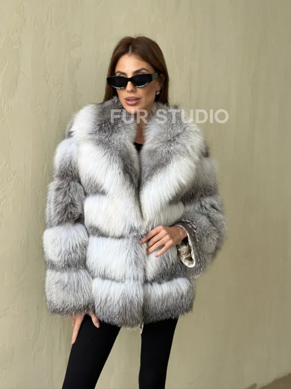 Шуба из меха арктической лисы - отличный выбор женщин, которые любят выглядеть стильно в зимнее время года. Мех смотрится шикарно и богато. Необычная расцветка подчеркнет цвет волос и глаз владелицы. В шубе будет комфортно в холодную зиму. Широкие манжеты делают акцент на тонкости кистей.