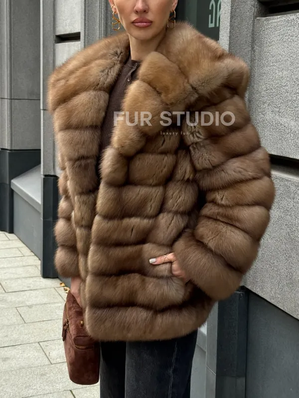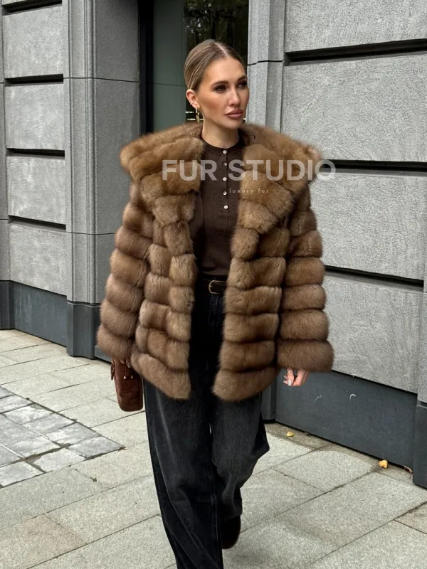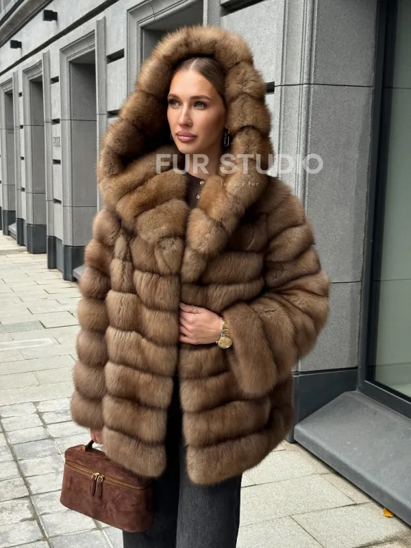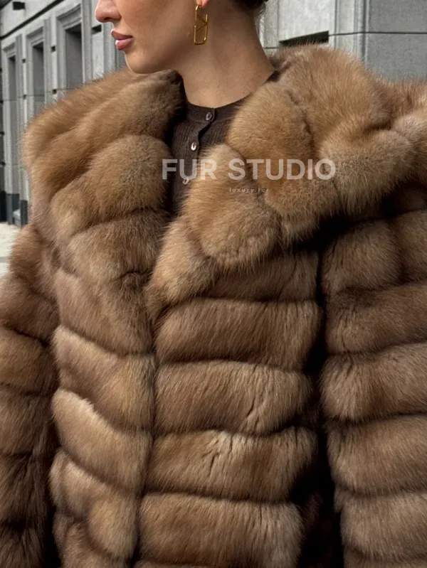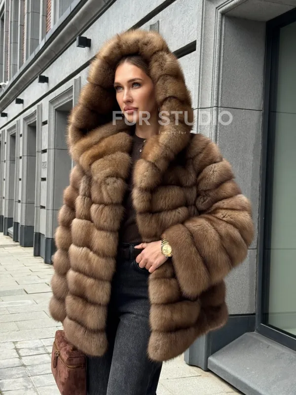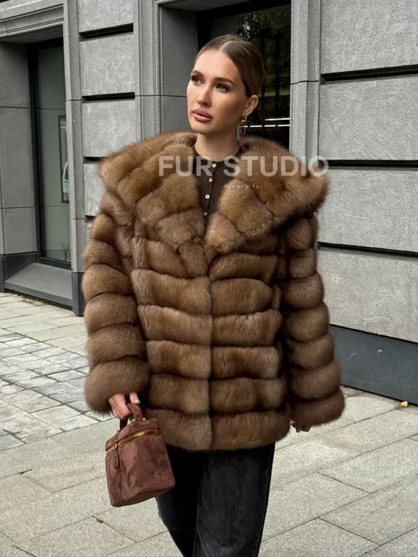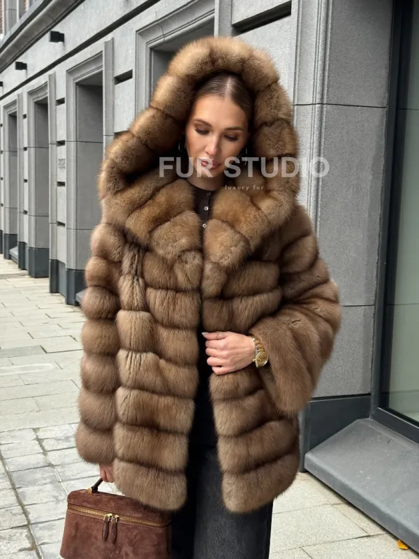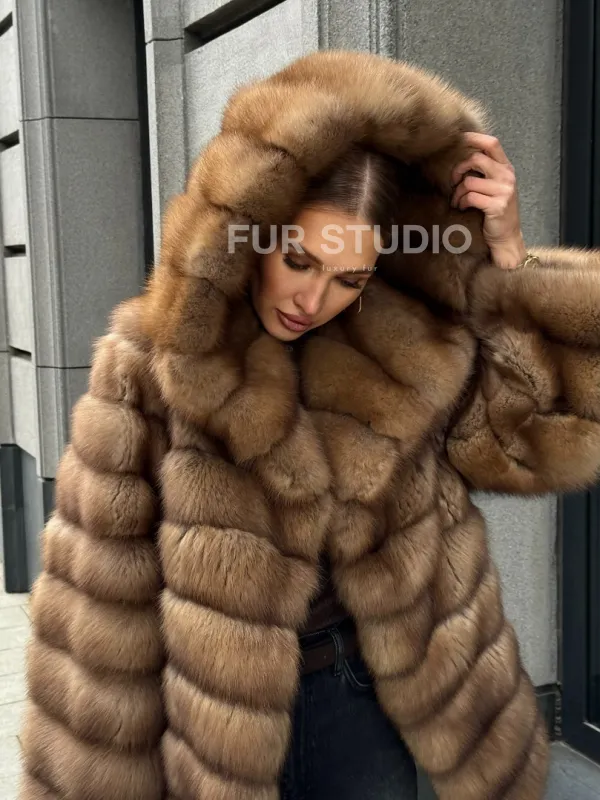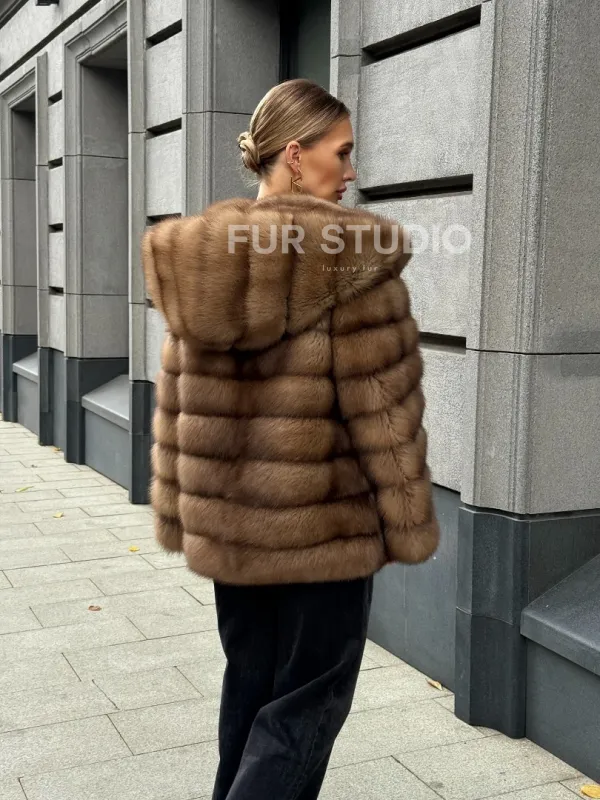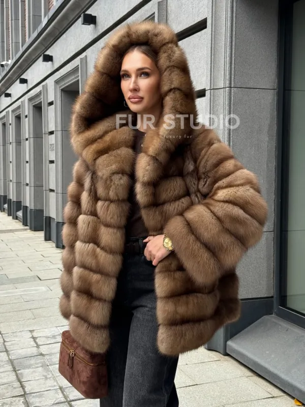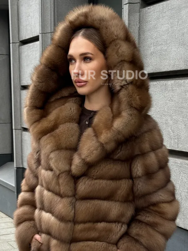 Шуба из натурального меха куницы с капюшоном 102364