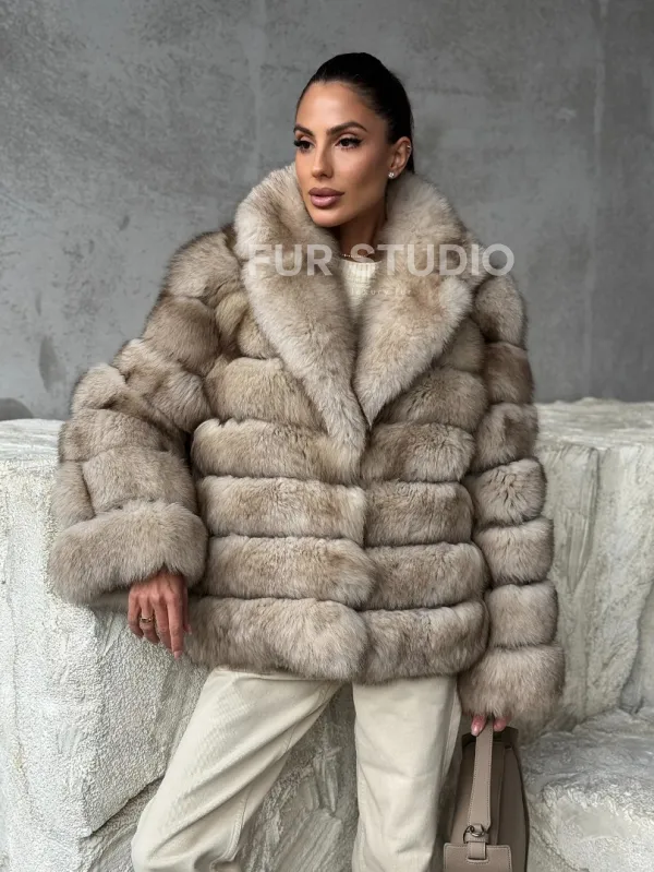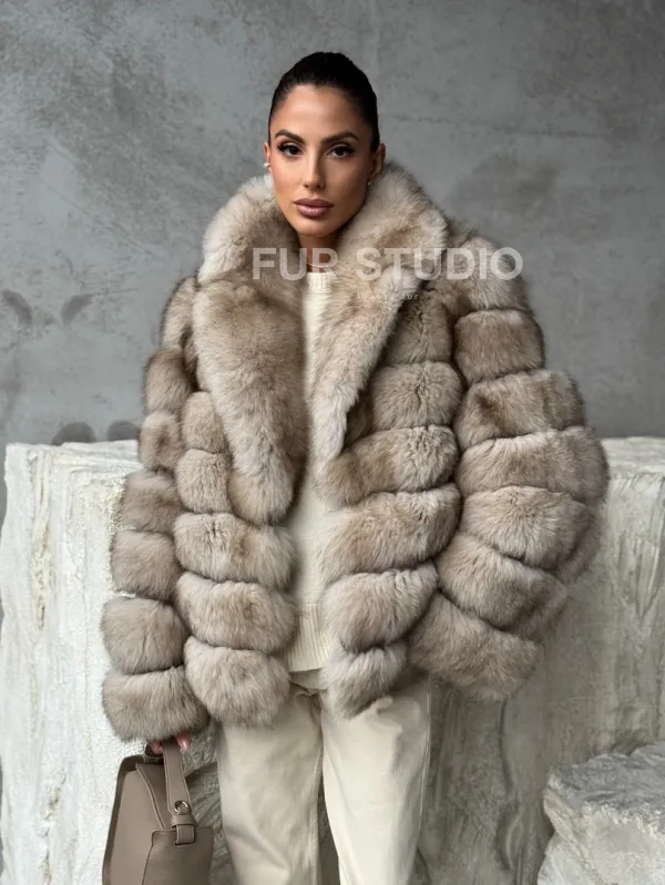 Мех данной шубы финский песец, цвет бежевый. Предлагается в размерах от 40 до 48. Длина модели 60-65 см, что выгодно подчеркивает фигуру девушек. Эта модель идеально подойдет для девушек и женщин, предпочитающих роскошные натуральные меха.