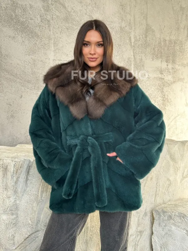 Мех данной шубы аукционная норка, цвет зеленый. Предлагается в размерах от 42 до 50. Длина модели 75-80 см, что выгодно подчеркивает фигуру девушек. Эта модель идеально подойдет для девушек и женщин, предпочитающих роскошные натуральные меха.