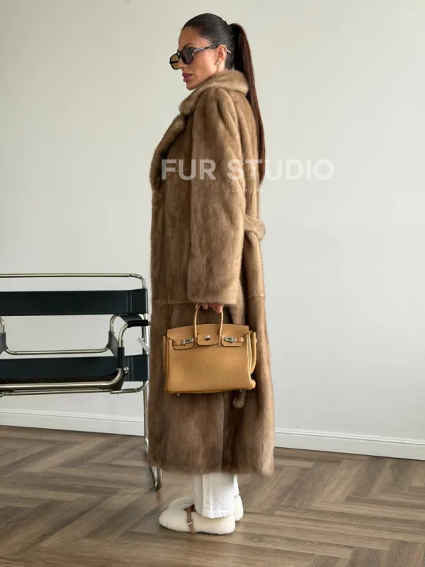 Мех данной шубы аукционная норка , цвет бежевый. Предлагается в размерах от 42 до 50. Длина модели 115-120 см, что выгодно подчеркивает фигуру девушек. Эта модель идеально подойдет для девушек и женщин, предпочитающих роскошные натуральные меха.