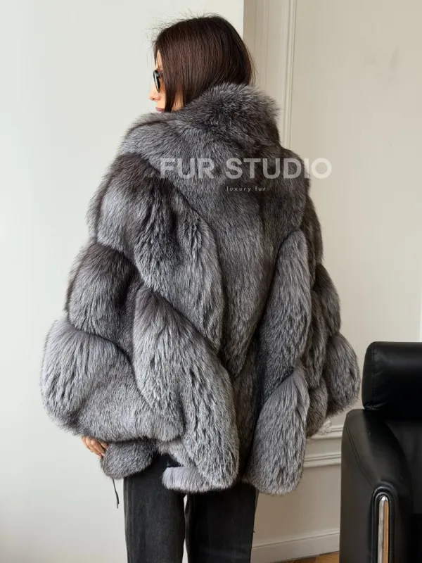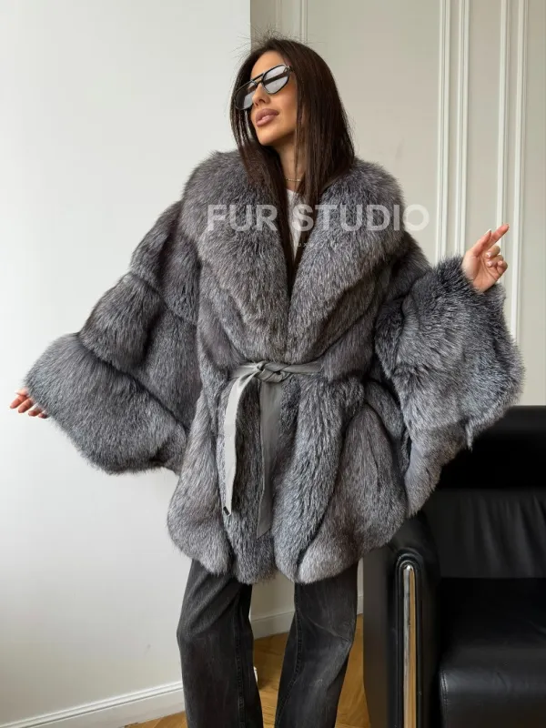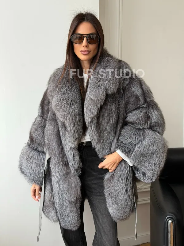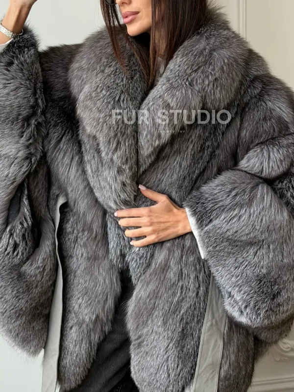 Мех данной шубы лиса, цвет серый. Предлагается в размерах от 42 до 52 (oversize). Длина модели 75-80 см, что выгодно подчеркивает фигуру девушек. Эта модель идеально подойдет для девушек и женщин, предпочитающих роскошные натуральные меха.