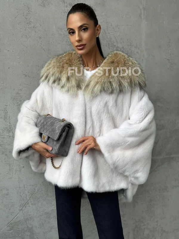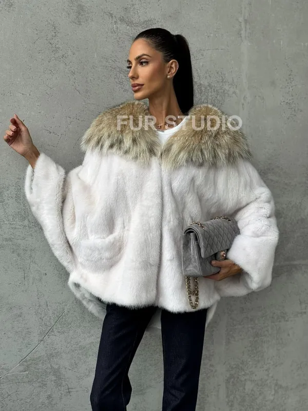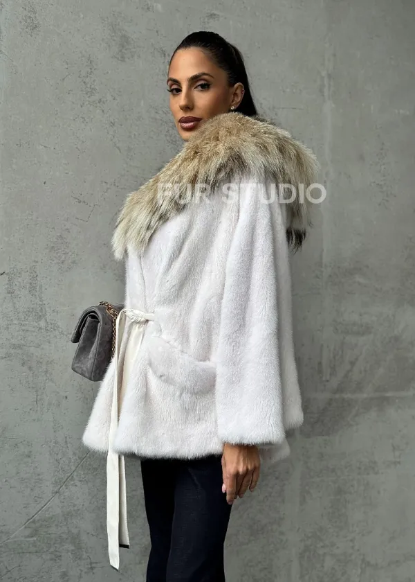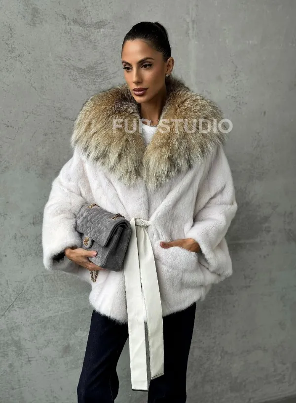 Мех данной шубы аукционная норка, цвет белый. Предлагается в размерах от 42 до 54 (oversize). Длина модели 70-75 см, что выгодно подчеркивает фигуру девушек. Эта модель идеально подойдет для девушек и женщин, предпочитающих роскошные натуральные меха.