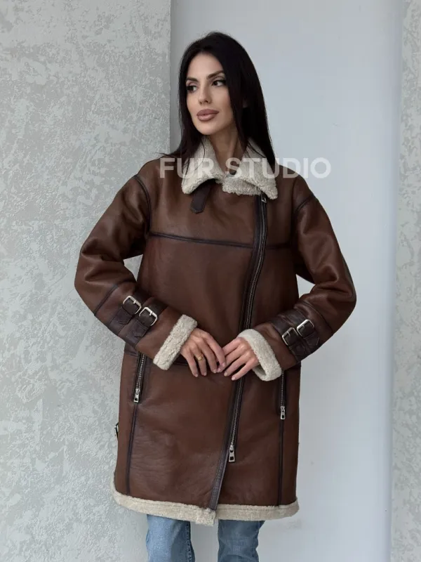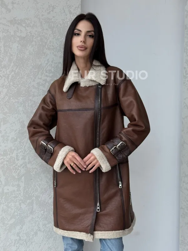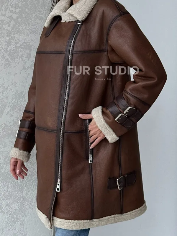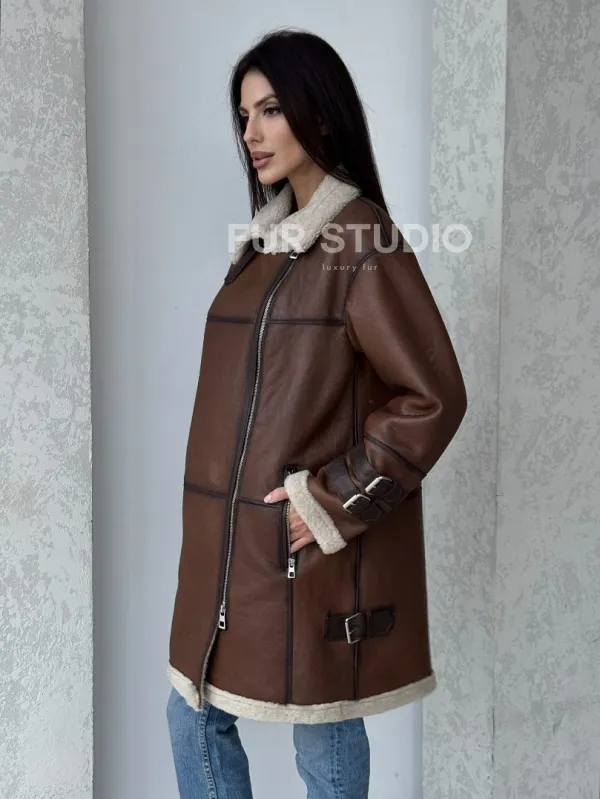 Удлиненная дубленка авиатор в коричневом цвете - винтажный стиль 100120