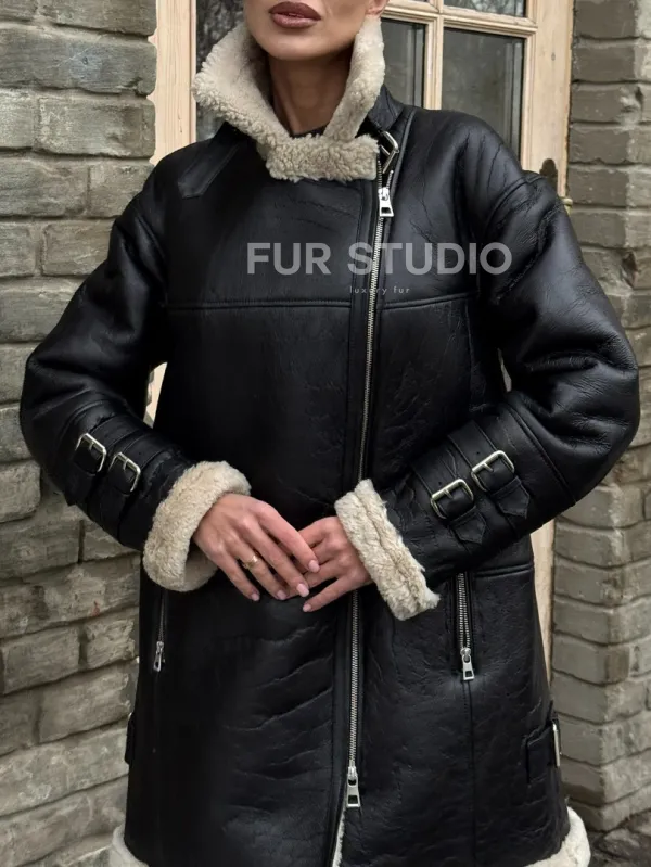 Удлиненная дубленка на белой овчине 100254