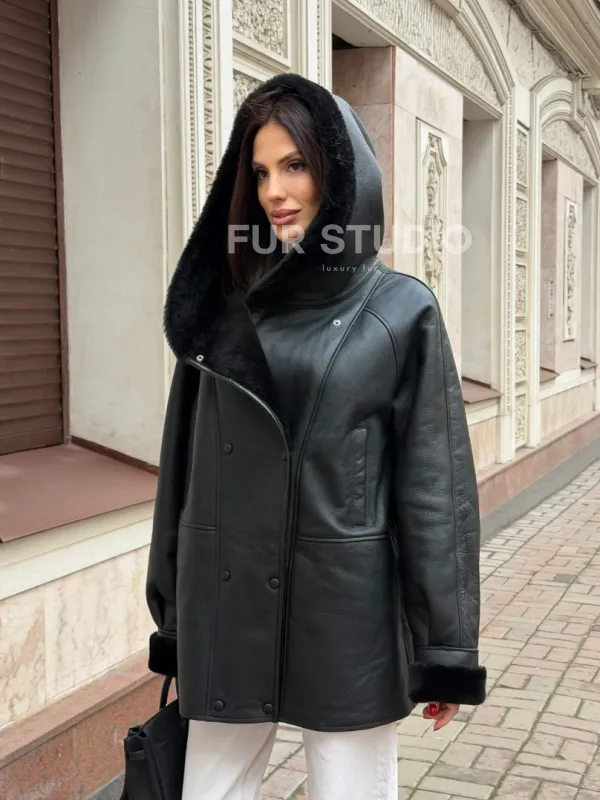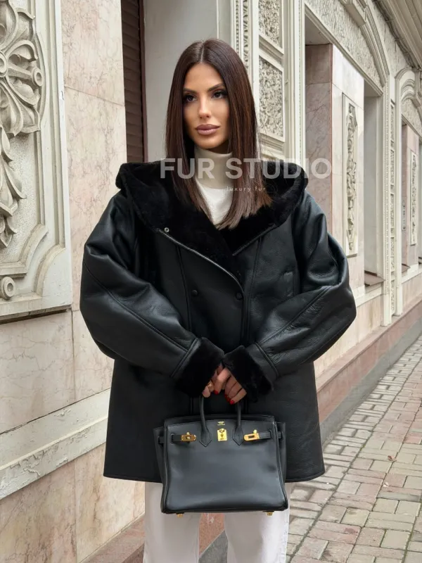 Женская дубленка с капюшоном 102768