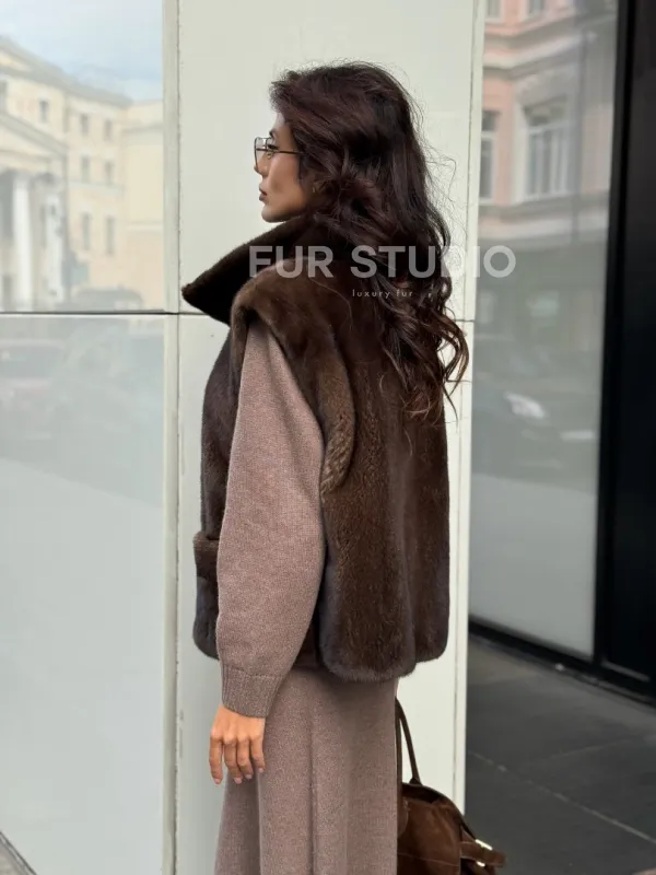 Мех данного жилета - аукционная норка, цвет коричневый. Идеальная длина модели 60-65 см лестно подчеркнет вашу фигуру. Эта модель станет неотъемлемой частью гардероба для женщин, предпочитающих непревзойденный стиль и роскошь натуральных материалов.